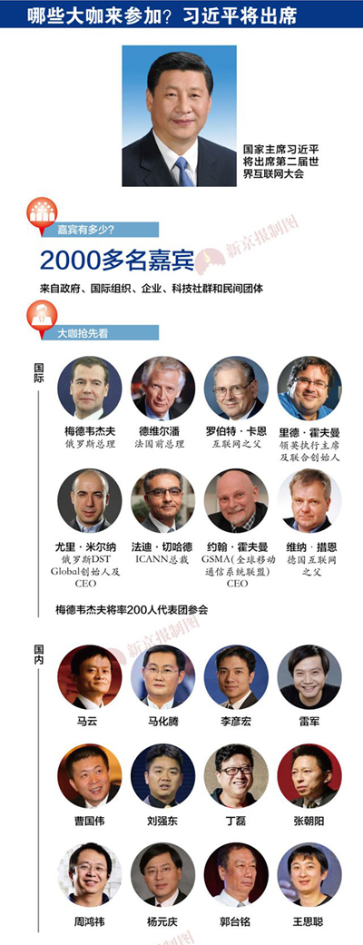 本屆世界互聯(lián)網(wǎng)大會(huì)主題為“互聯(lián)互通共享共治——共建網(wǎng)絡(luò)空間命運(yùn)共同體”。與去年相比,本屆大會(huì)規(guī)模更大。大會(huì)將有2000多名嘉賓與會(huì),中外嘉賓比例約各占50%,其中有8位外國(guó)領(lǐng)導(dǎo)人,近50位外國(guó)部長(zhǎng)級(jí)官員,包括俄羅斯總理梅德韋杰夫、巴基斯坦總理謝里夫、哈薩克斯坦總理馬西莫夫、吉爾吉斯斯坦總理薩里耶夫、塔吉克斯坦總理拉蘇爾佐達(dá)等。